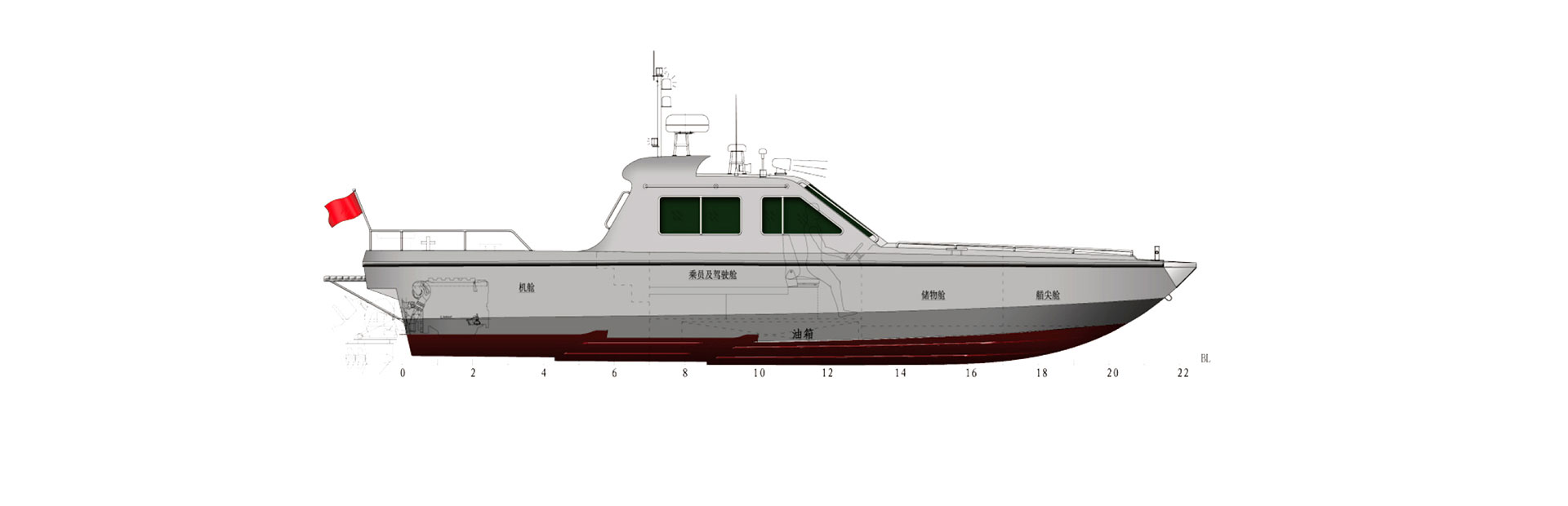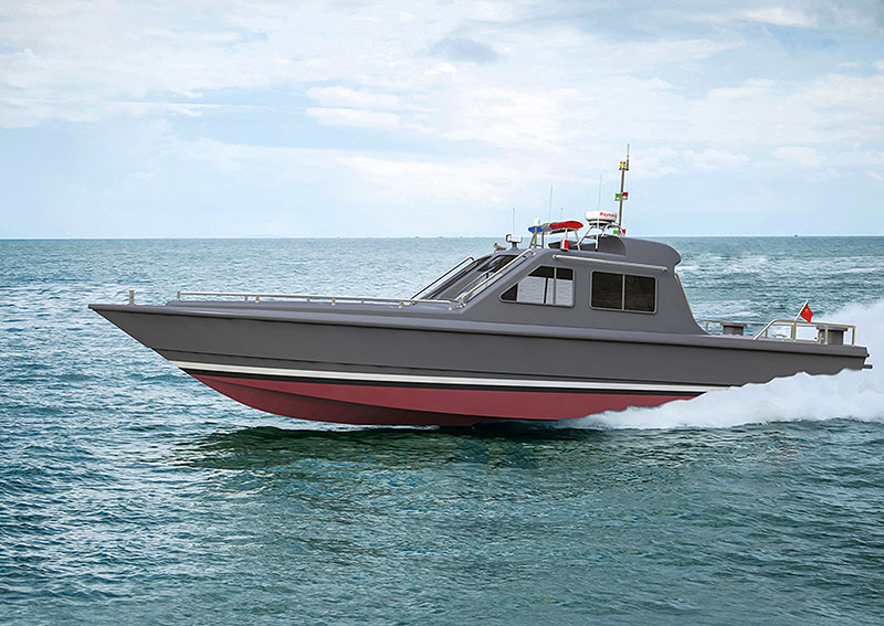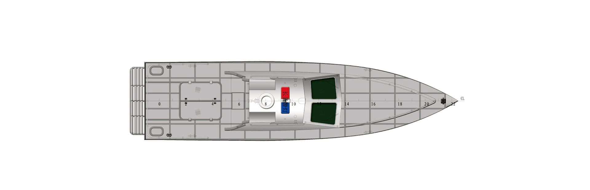 总长(m):11.8 型宽(m):3.0 型深(m):1.62 吃水(m):0.58 主机功率(kw):280*2 设计航速(kn):45.0 水线长(m):10.23 航区:沿海航区 乘员(人):6 续航力(海里):230