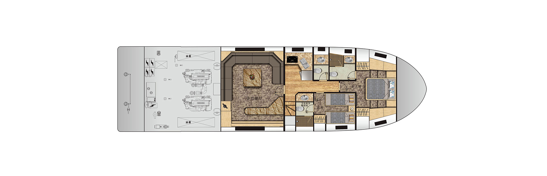艇长(m):21.6 艇宽(m):5.8 吃水(m):1.1 主机功率(kw):588*2 设计航速(kn):16.0 推进方式:常规直轴推进 航区:沿海航区 乘员(人):15 续航力(海里):300
