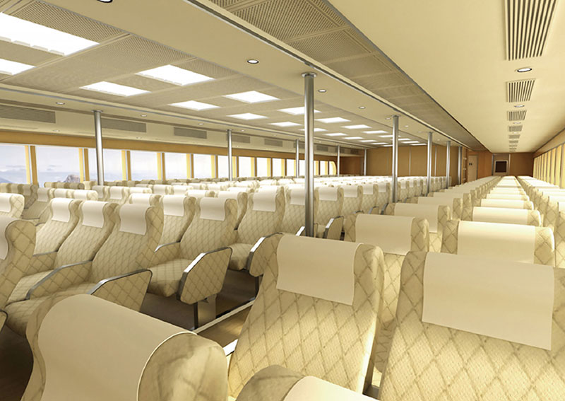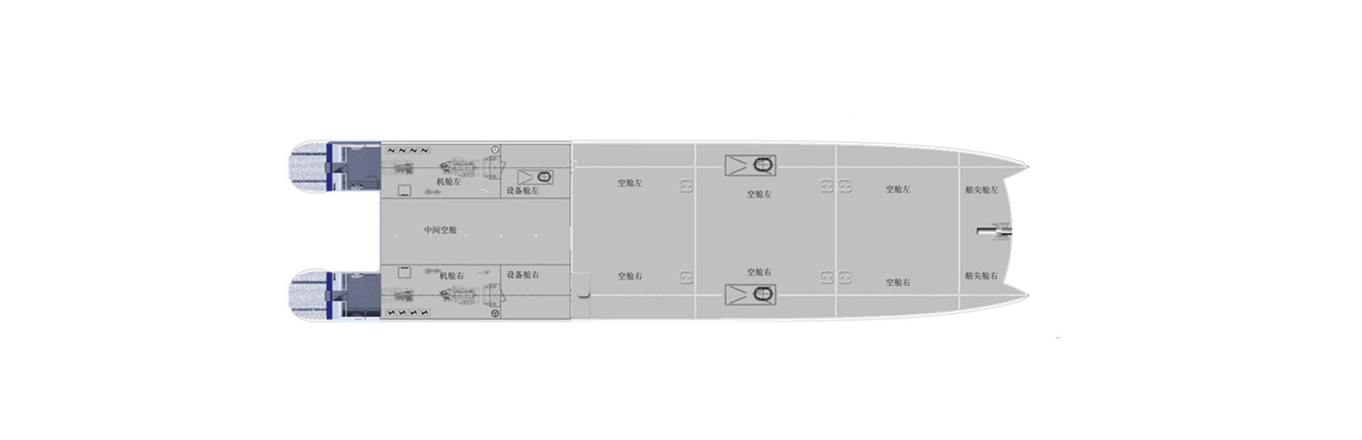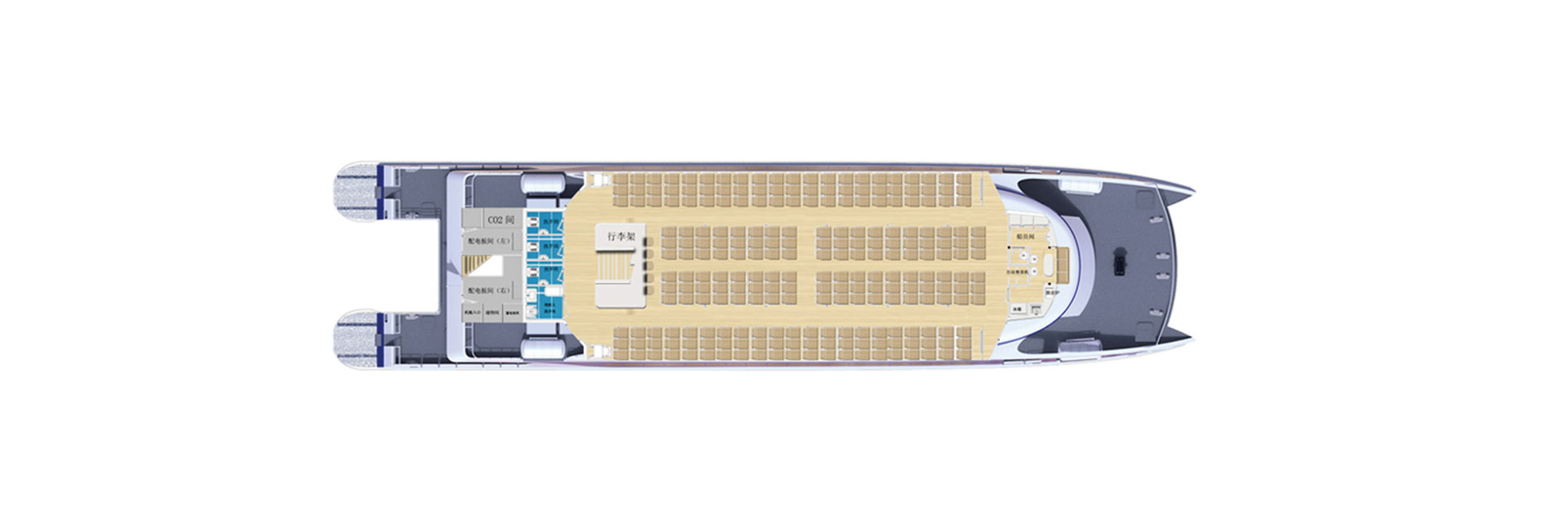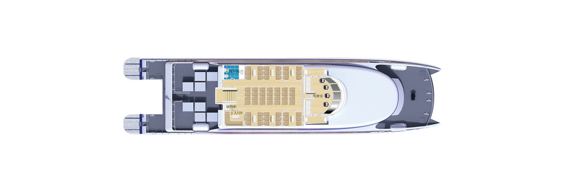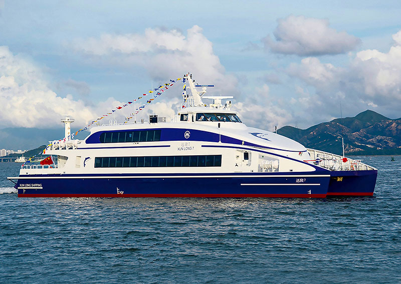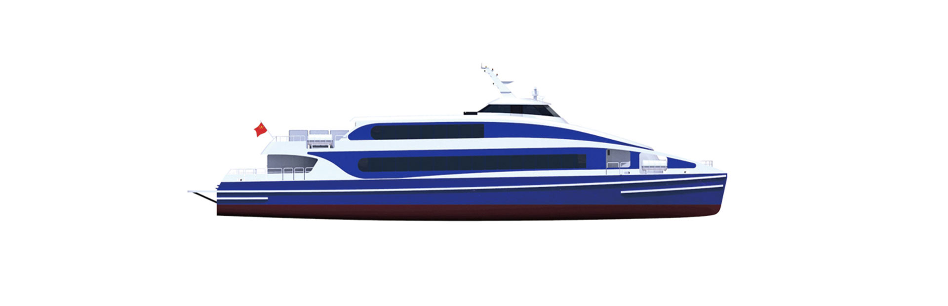 船长(m):42.3 船宽(m):10.0 吃水(m):1.3 水线长(m):39.5 主机功率(kw):1440*2 设计航速(kn):32.5 航区:沿海航区 乘员(人):290 续航力(海里):300 推进方式:喷泵推进