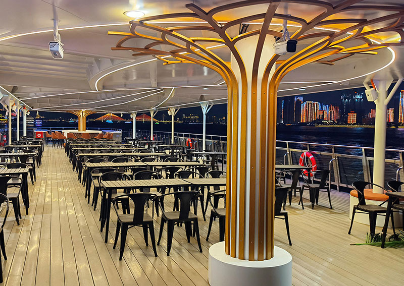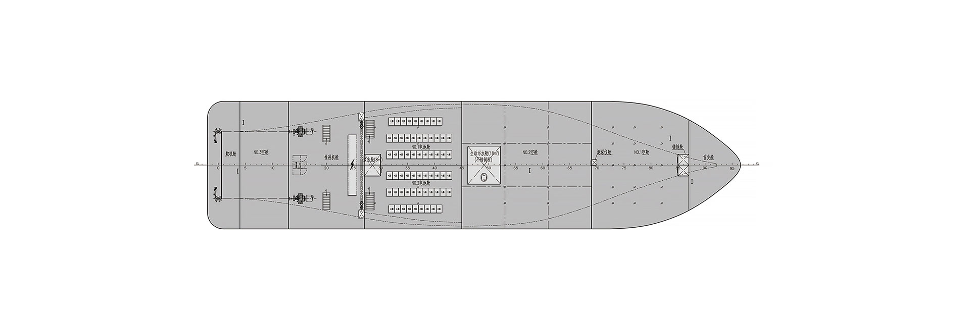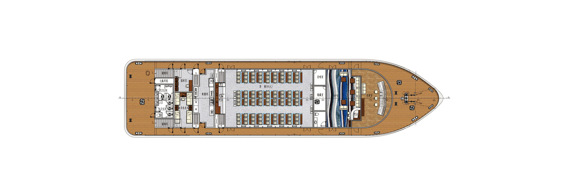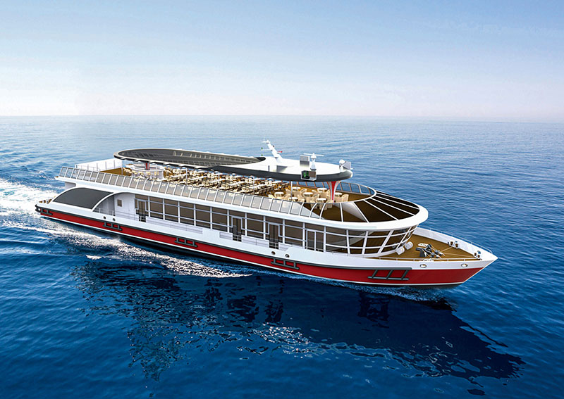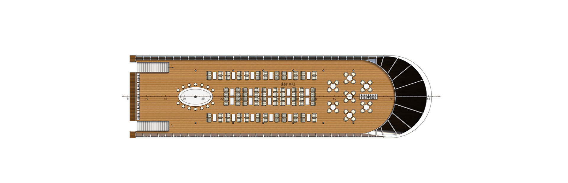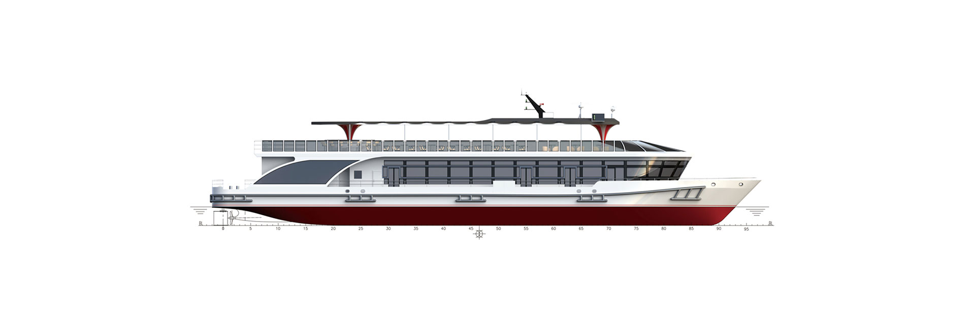 船长(m):49.27 船宽(m):11.8 型深(m):2.7 吃水(m):1.6 推进电机(kw):150*2 锂电容量(kw.h):1881 设计航速(kn):9.7 航区:B级航区 乘员(人):200 续航力(h):6