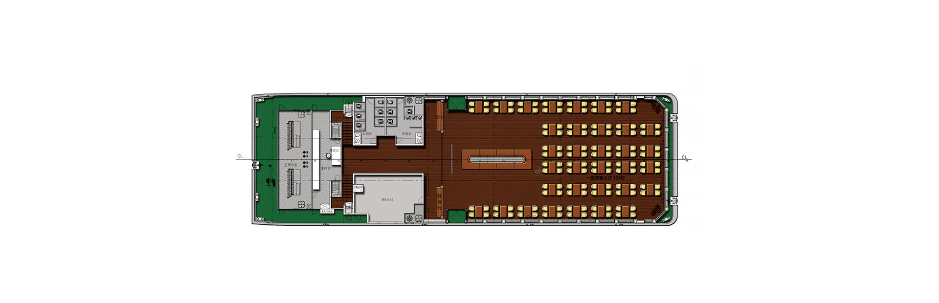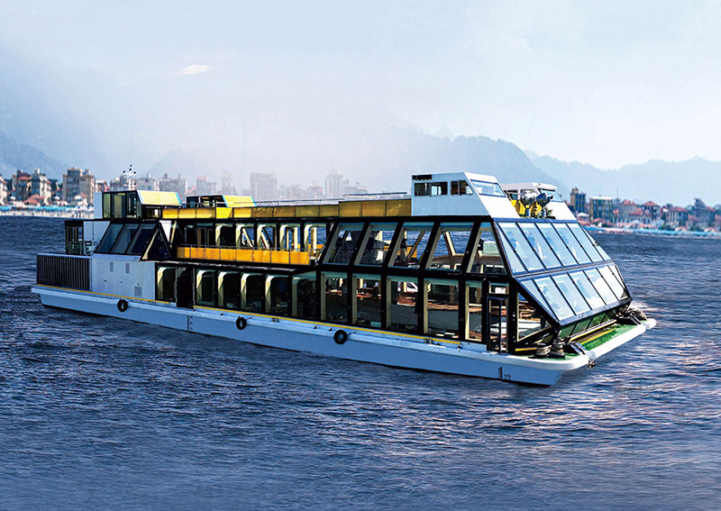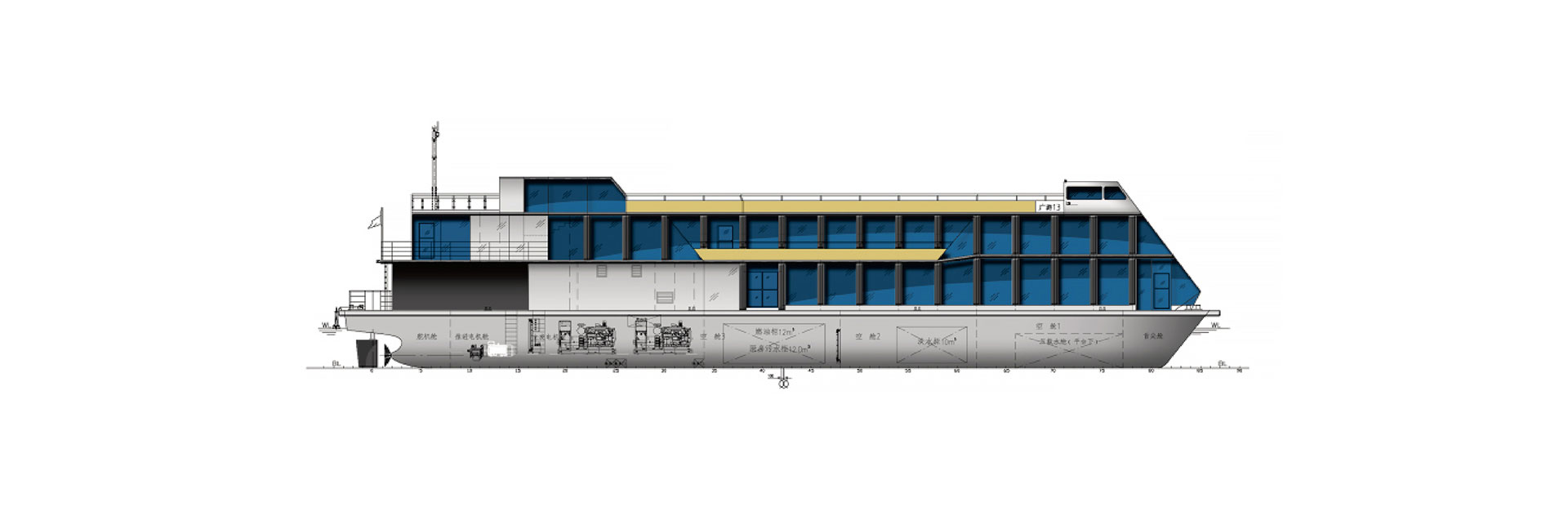 船长(m):45.2 船宽(m):13.5 吃水(m):2.5 水线长(m):43.5 推进电机(kw):200*2 设计航速(kn):10.0 航区:内河B级 乘员(人):390 续航力(海里):1480 推进方式:柴电推进