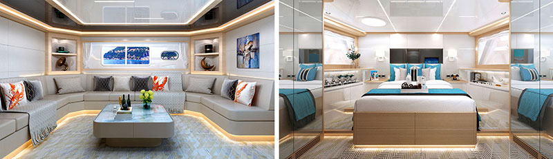 步入舱内,精选的皮革座椅,不仅触感柔软,更在细节处彰显尊贵。宽敞的客厅区域,为您和您的宾客提供了充足的活动空间。还配备了先进的娱乐系统和高保真音响,无论是举办盛大的海上派对,还是与家人朋友共度一段宁静的海上时光,都能全方位满足您的需求。