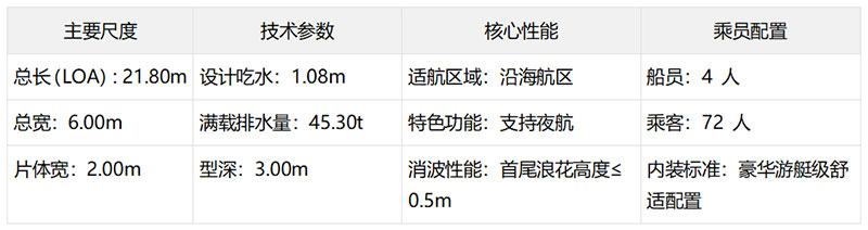 动力与适航性双优:采用双机双桨双舵柴油机动力系统,在保障强劲动力的同时,实现优异的耐波性与操控灵活性,即使在6级风浪中仍能保持平稳航行。