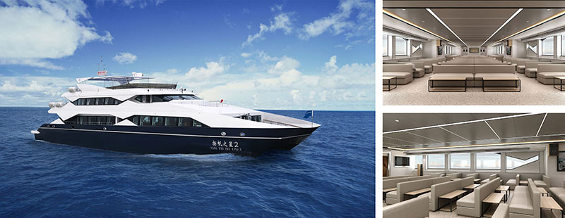 作为必赢集团bwin高性能玻璃钢双体船的迭代之作,两艘新船在布置、内装、载客、航速、船体阻力等12项核心性能指标上实现全面优化。通过船模试验反复验证的黄金线型,不仅将船体阻力降至行业领先水平,更以豪华游艇的设计美学重塑海上航行的视觉体验——威严大气的船身线条如利刃破水,流畅曲面勾勒出飞逸动感,让船舶在静止时亦如蓄势待发的海上精灵。